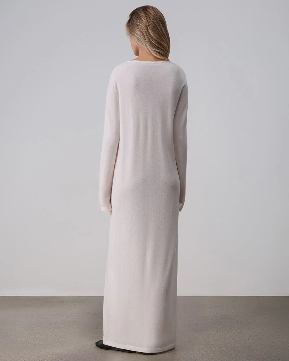 A long straight dress crafted from soft fine-knit cashmere in an ivory shade. Lightweight and delicate, it envelops the body in warmth, creating a comforting cocoon-like feeling even in cold weather. The central button fastening allows the neckline to be adjusted and enhances the minimalist character of the piece. The maxi length creates a clean, harmonious silhouette that can be styled with accessories to suit the mood.
