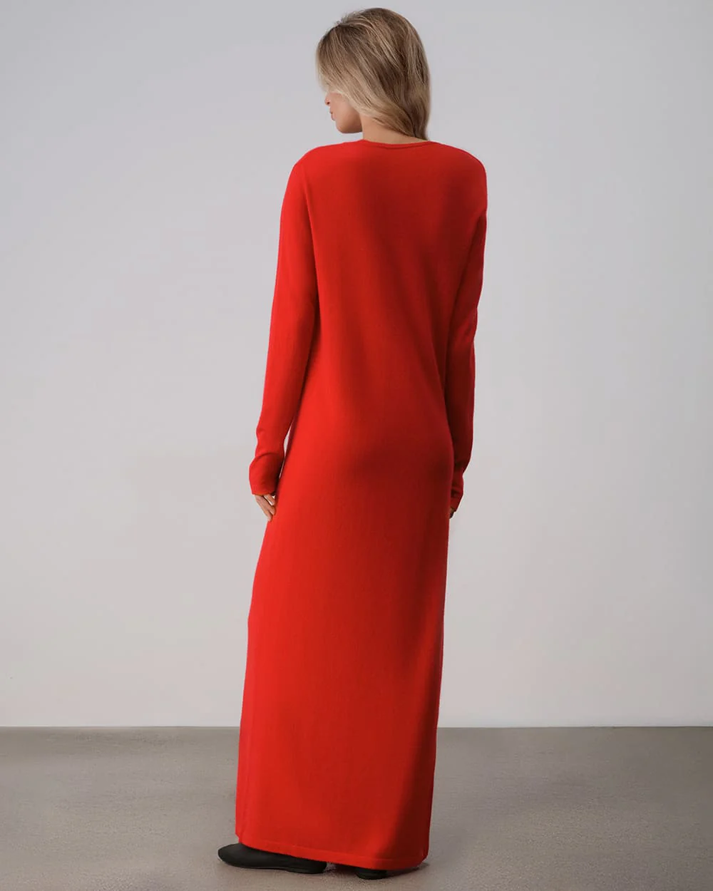A long straight dress crafted from soft fine-knit cashmere in a red shade. Lightweight and delicate, it envelops the body in warmth, creating a comforting cocoon-like feeling even in cold weather. The central button fastening allows the neckline to be adjusted and enhances the minimalist character of the piece. The maxi length creates a clean, harmonious silhouette that can be styled with accessories to suit the mood.