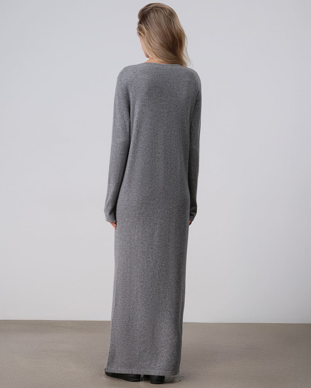 A long straight dress crafted from soft fine-knit cashmere in a grey shade. Lightweight and delicate, it envelops the body in warmth, creating a comforting cocoon-like feeling even in cold weather. The central button fastening allows the neckline to be adjusted and enhances the minimalist character of the piece. The maxi length creates a clean, harmonious silhouette that can be styled with accessories to suit the mood.