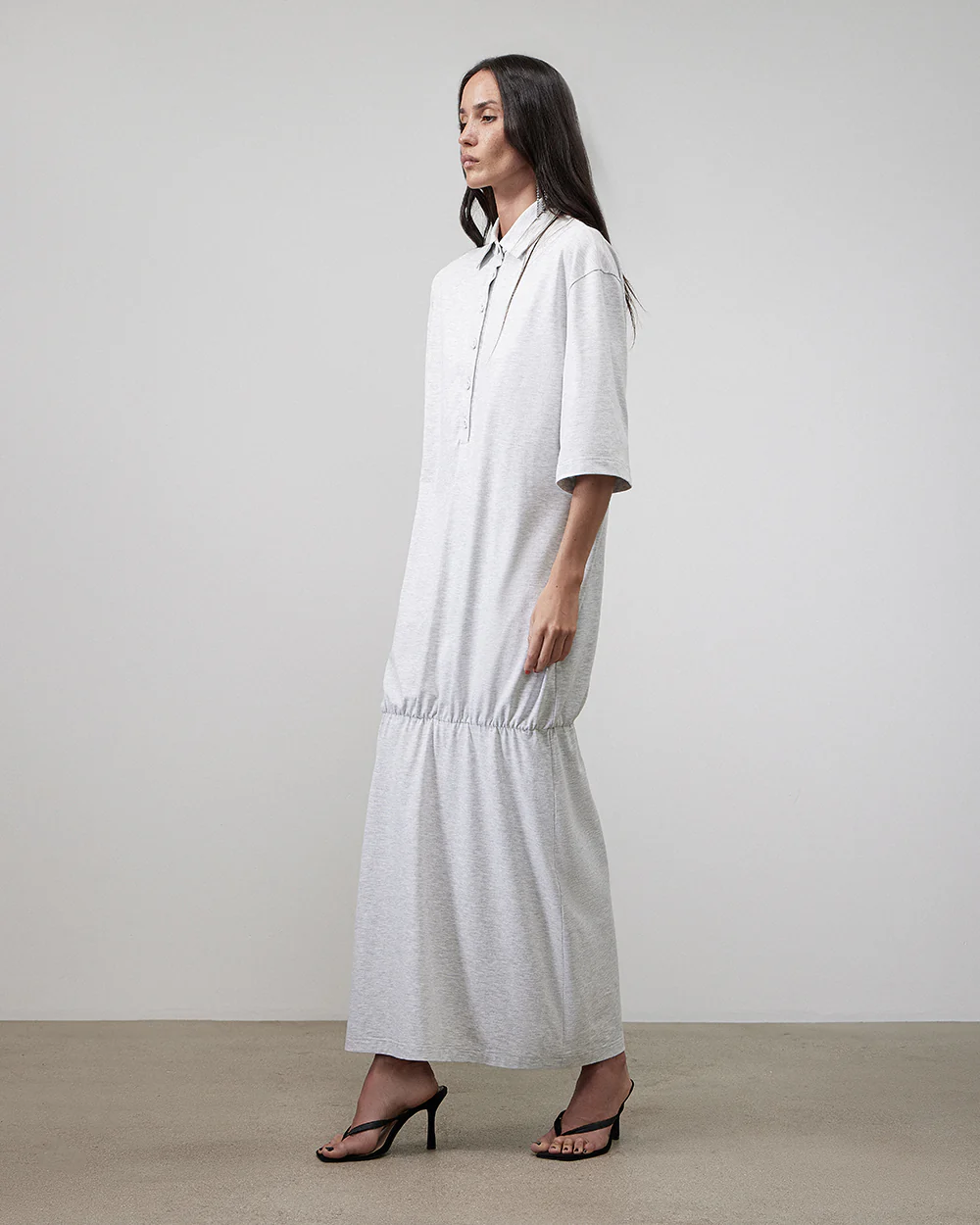 A versatile staple with a sleek stand-up collar and short sleeves, designed to adapt effortlessly to any style. Hidden inner ties allow you to adjust the elasticized waistband for a customizable fit, while also letting you play with the skirt’s length—perfect for switching up your look in an instant to match your mood or occasion.