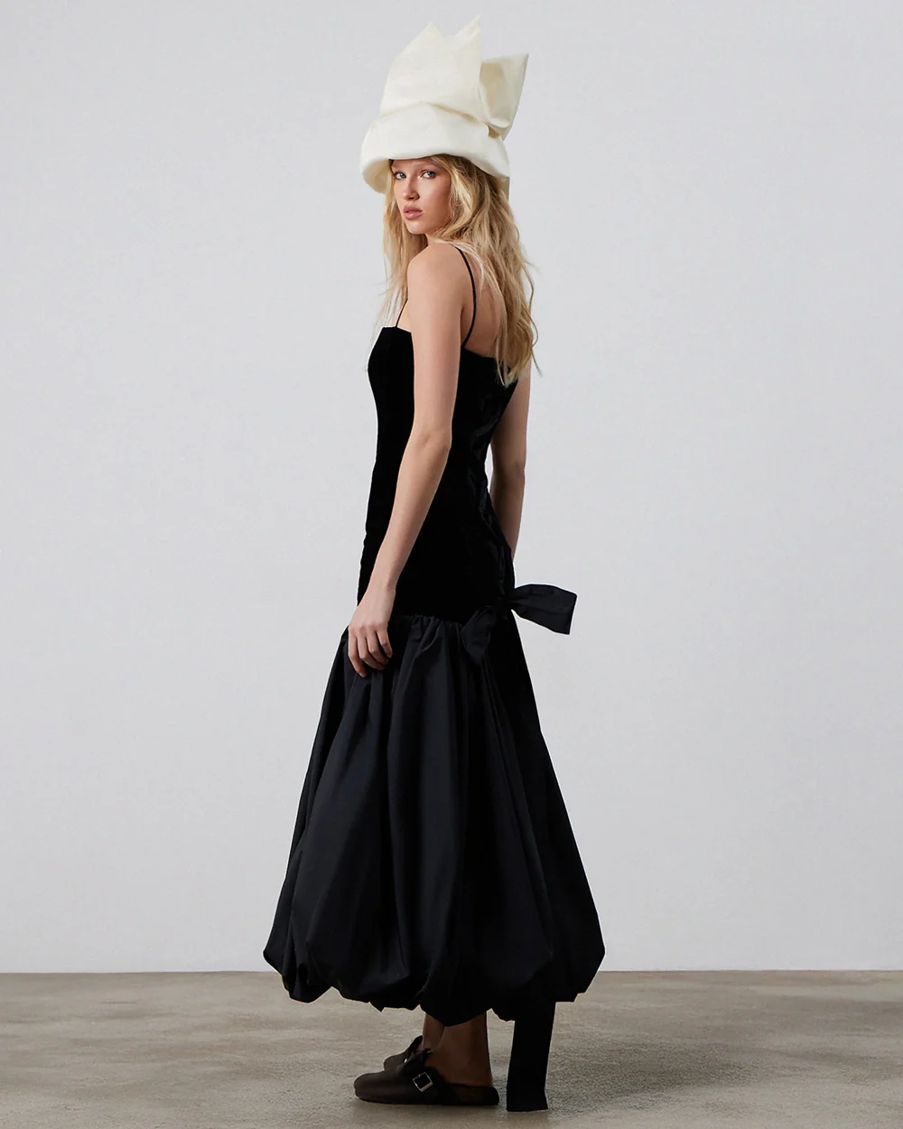 An evening corset dress with a balloon skirt. The bodice, crafted from glossy black velvet, highlights the waist and shoulder line, while the voluminous skirt made from dense textured fabric creates a striking silhouette. The main idea behind the design was to achieve maximum comfort without compromising the classic corset aesthetic: the perfect fit is ensured not by boning but through meticulous tailoring and sturdy adjustable ribbons that allow for precise control of the desired level of support.
