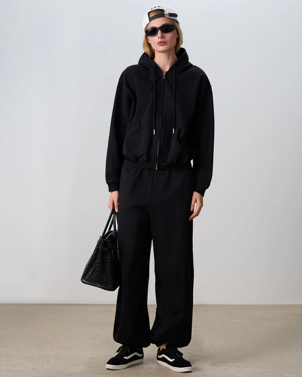 A basic black zip-up hoodie. The relaxed fit allows complete freedom of movement, making it easy to layer over T-shirts, tops or long-sleeve pieces. The soft shoulder line, adjustable drawstring hood and neat cuffs create a clean silhouette without unnecessary accents. The front zip adds practicality, allowing the hoodie to be easily put on and adjusted for comfort in different temperatures. Kangaroo pockets provide added convenience, while the deep black shade ensures versatility and a polished finish to any look.