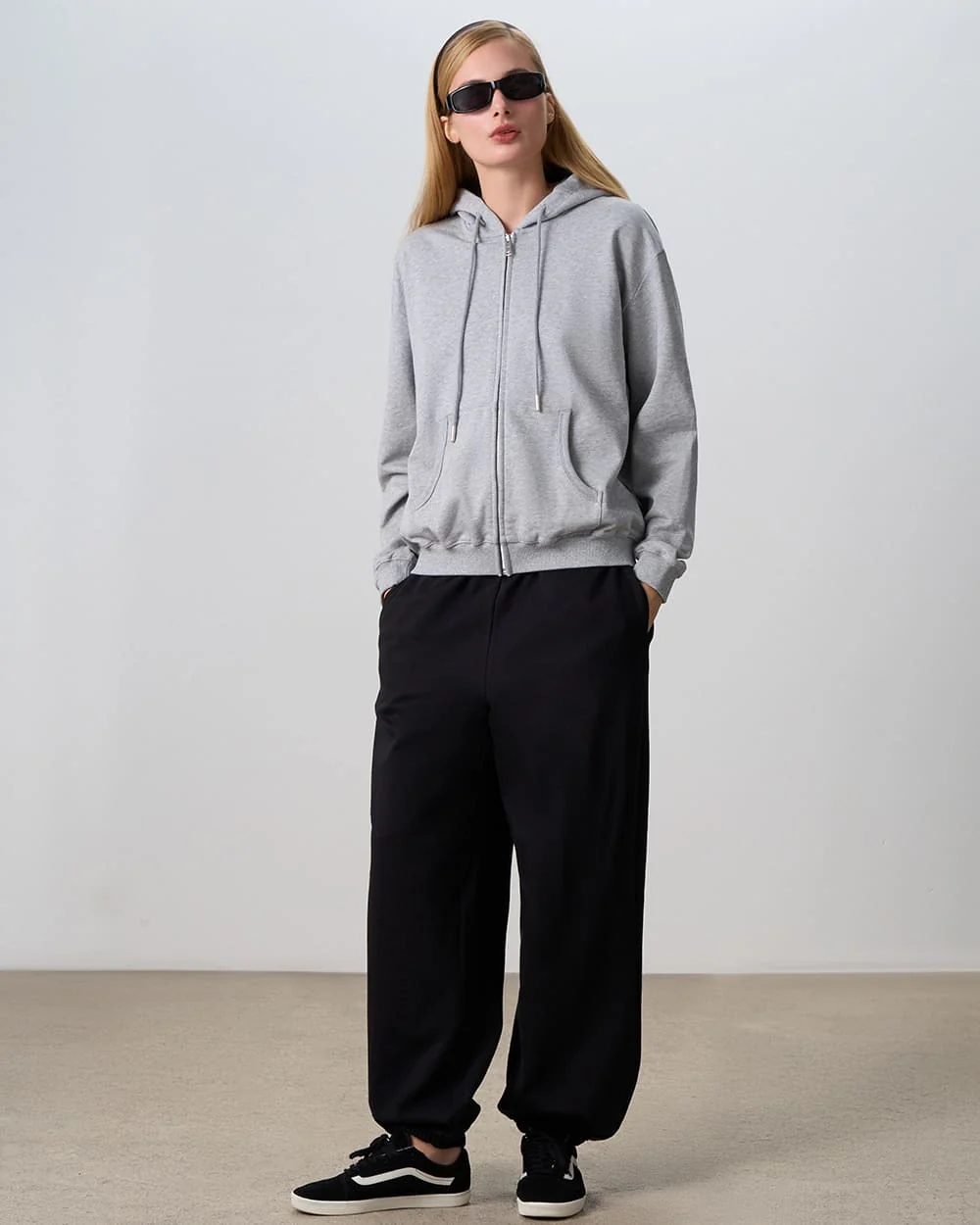 A basic grey zip-up hoodie. The relaxed fit allows complete freedom of movement, making it easy to layer over T-shirts, tops or long-sleeve pieces. The soft shoulder line, adjustable drawstring hood and neat cuffs create a clean silhouette without unnecessary accents. The front zip adds practicality, allowing the hoodie to be easily put on and adjusted for comfort in different temperatures. Kangaroo pockets provide added convenience, while the neutral grey shade pairs effortlessly with a variety of colours and textures.