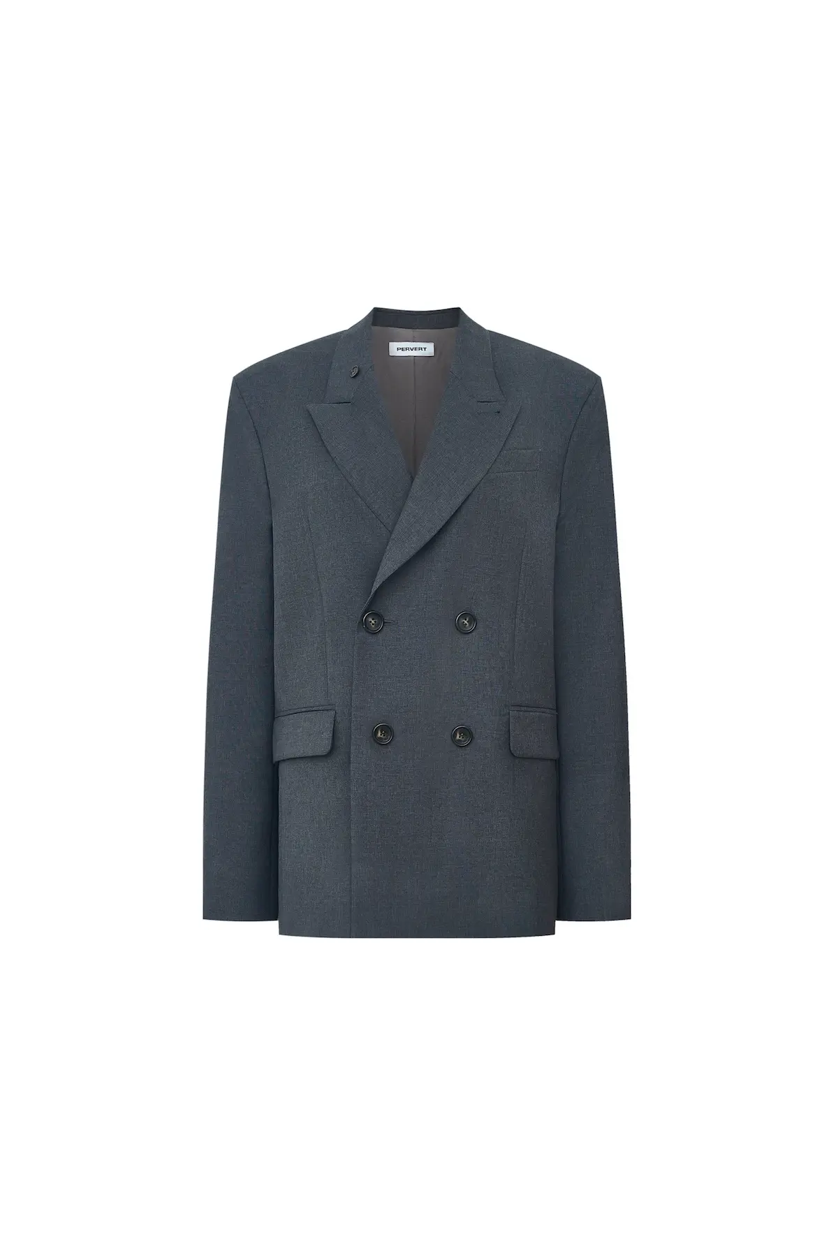 Double-breasted four-button tailored oversize " Uncle's" jacket made with responsible wool with a peaked lapel and two welt pockets