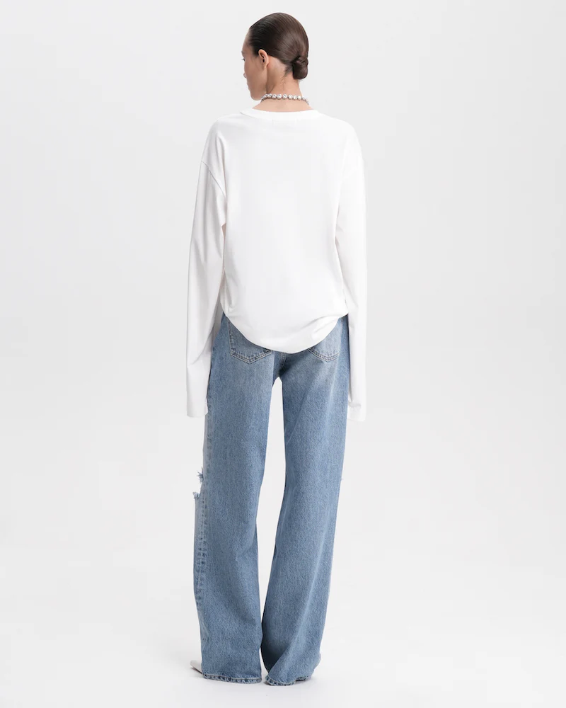 Mid-rise loose-fit jeans with knee slits and a button-fly closure. Made from durable blue denim, these jeans are comfortable and resistant to wear. They feature five pockets and decorative distressing above the knees.