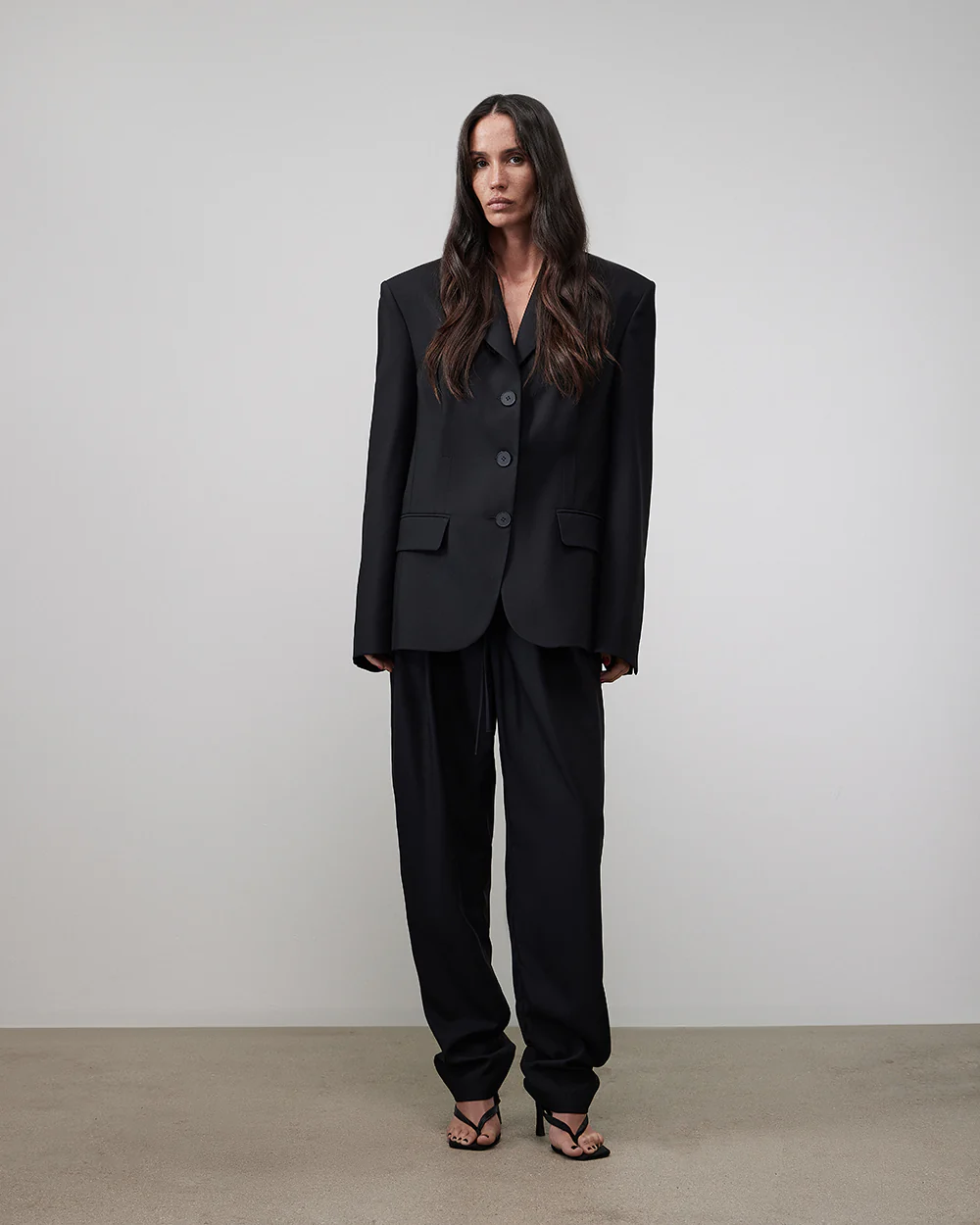 Low-rise wool trousers. The relaxed fit, elastic waistband, and side pockets make the piece effortlessly comfortable, while the pressed creases add structure and visually elongate the silhouette. A drawstring at the waist allows for a customizable and secure fit.