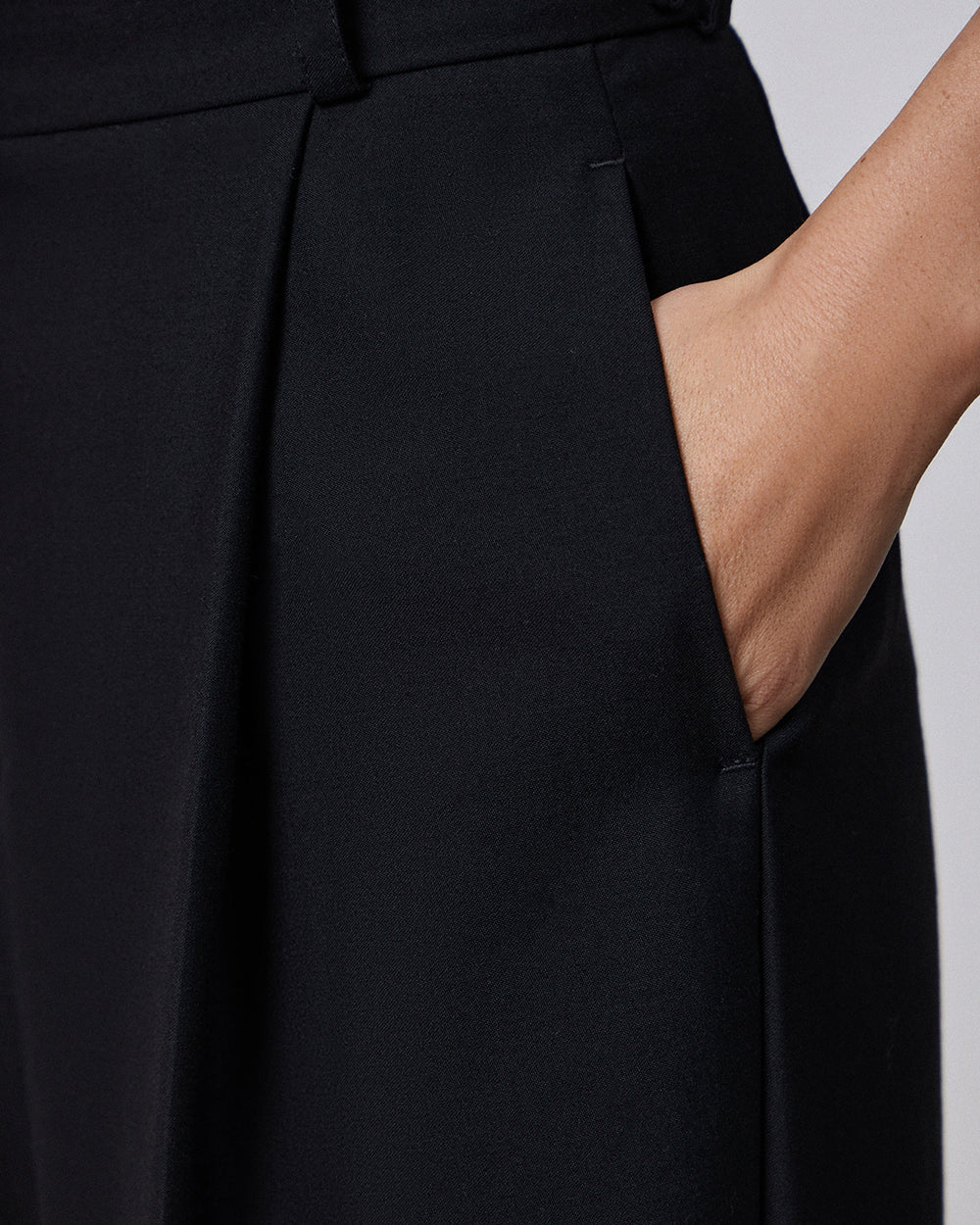 Straight formal trousers made from premium Italian wool in black. The fabric is distinguished by its lightness and smooth texture. Elegance is highlighted by neat thin pleats smoothly transitioning into pressed creases running down the legs. Ideal pairing with the "Kir Royal" jacket.