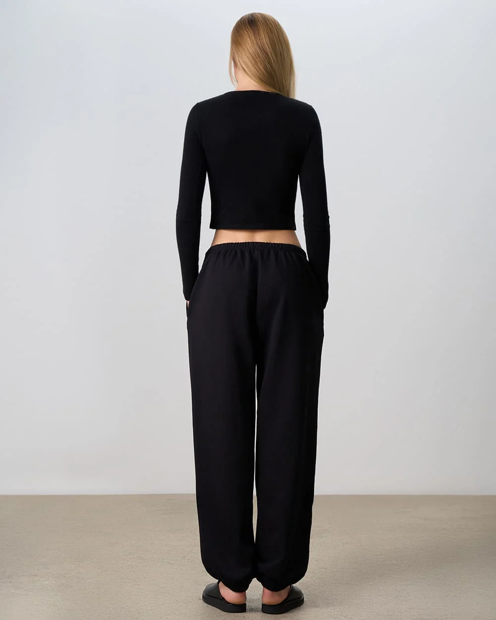 Basic black cotton joggers. The straight relaxed cut ensures a comfortable fit, making them suitable for almost any occasion. The drawstring waistband allows for an adjustable fit, while the soft elasticated cuffs neatly secure the length and define the shape. The breathable fabric feels comfortable against the skin and is ideal for everyday wear. Perfect when paired with tops from the Offshore collection.