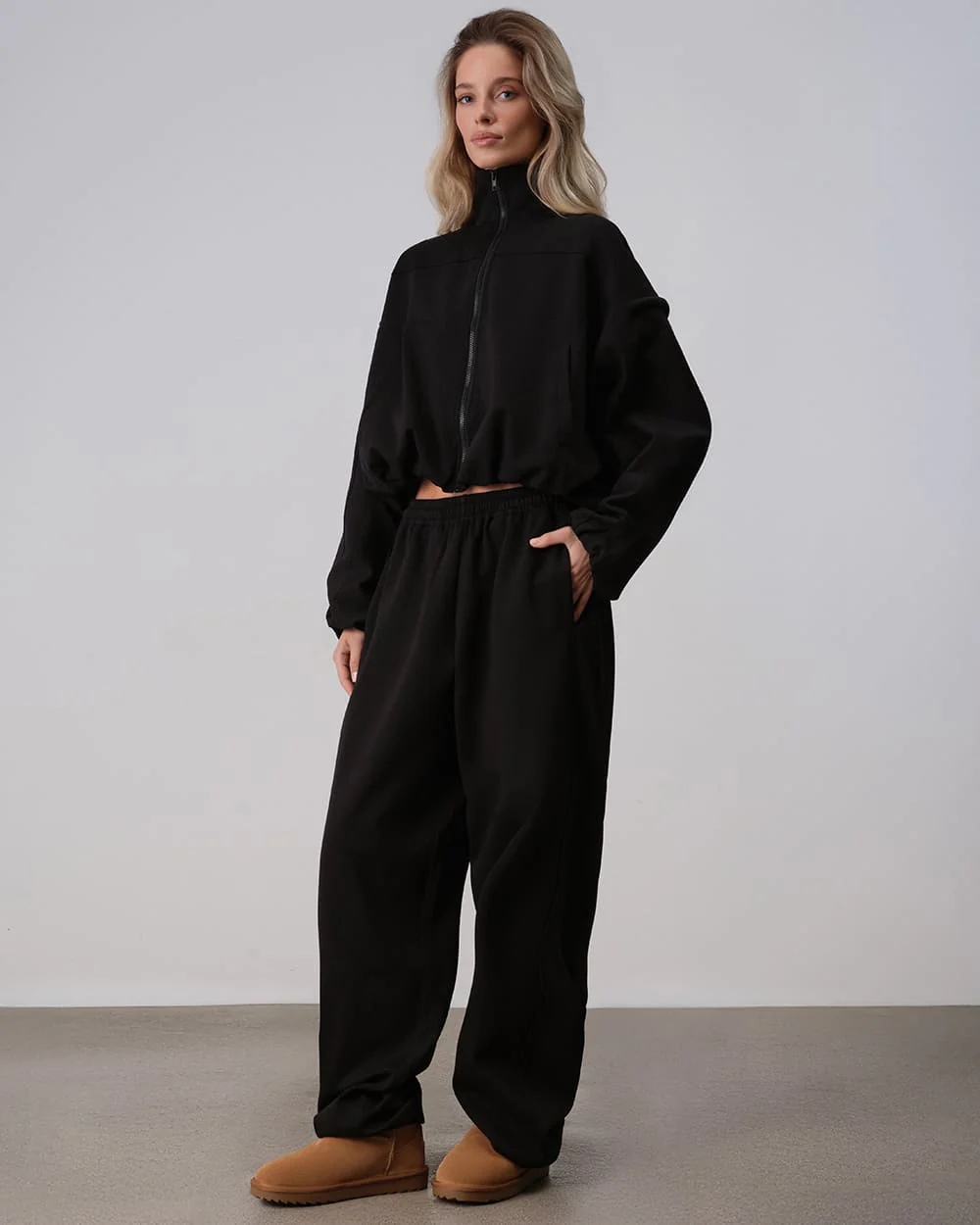 Straight sporty trousers crafted from blended cotton. Relaxed and comfortable, they are ideal for everyday wear. The waistband is finished with a drawstring for an adjustable fit, while the hems are регулируated with elastic cords and stoppers. The matching “Rusana” jacket completes the perfect laid-back look.