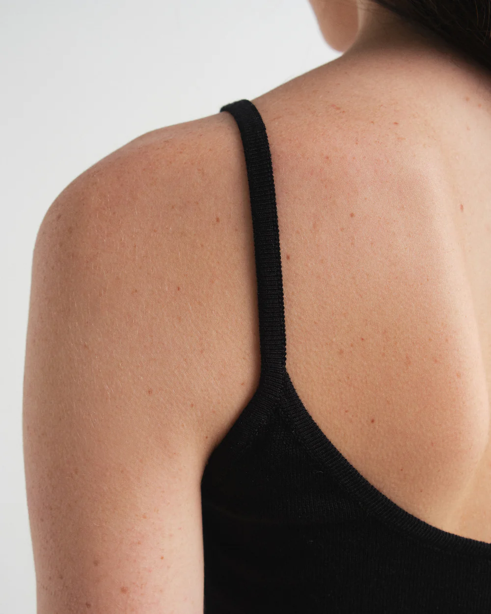 A cropped, form-fitting top on thin straps. The soft, fine-knit fabric made from organic cotton thread clings closely to the body, creating a "second skin" effect. Thanks to its composition and texture, the garment is comfortable to wear in both warm and cool weather.