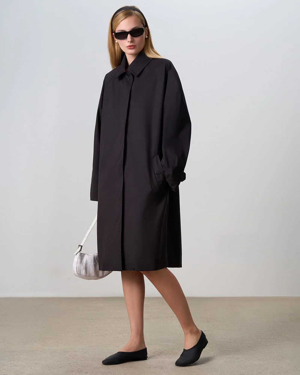 A strict straight-cut trench coat crafted from a cotton-blend fabric. A restrained and practical piece that serves as an ideal foundation for the coming spring. The soft-angled spread collar allows the model to be styled with both tailored and more relaxed looks. The matte fabric appears calm and refined without distracting shine, holds its shape well, and reliably protects against wind and moisture. The concealed button fastening maintains the clean line of the silhouette and gives the piece a more composed appearance.