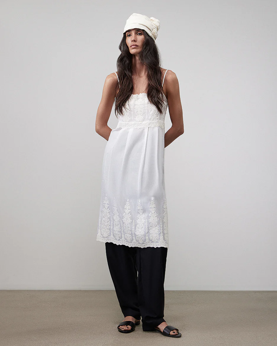 This airy, semi-sheer tunic is crafted from a lightweight blend of natural silk and cotton. Delicate straps and intricate embroidery add a touch of elegance, while the raised waistline and side slits in the skirt ensure comfort and ease of movement—perfect for pairing even with loose-fitting bottoms. Ideal when styled with "Saint-Tropez" trousers.