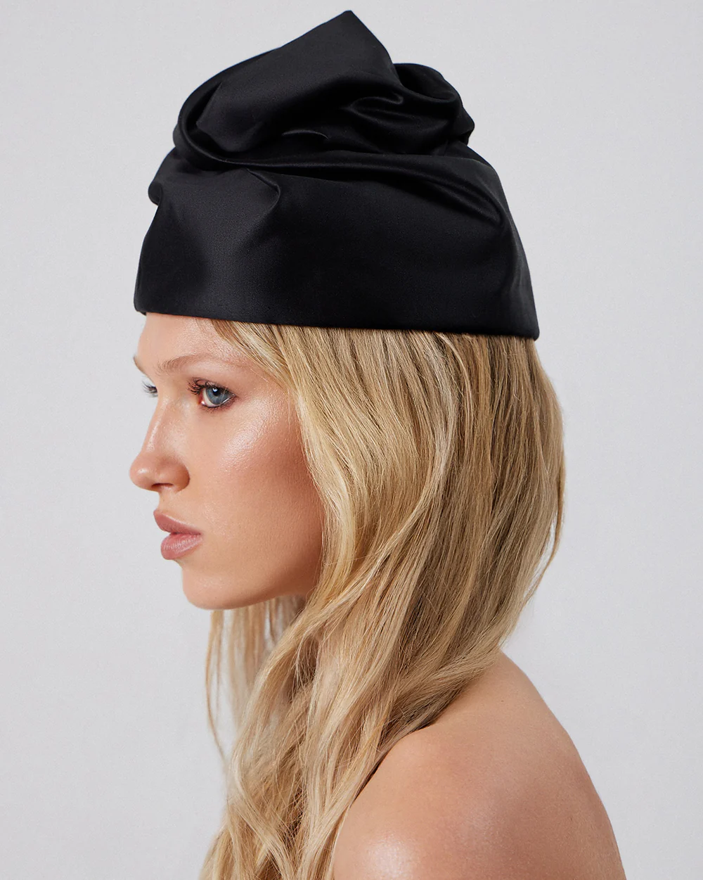 A tall black turban with decorative folds forming a floral motif. Compact in size, it will integrate harmoniously into any evening look. This headpiece is the result of meticulous work by theatrical artisans, making each one uniquely individual. Crafted from soft cotton and silk, it ensures a comfortable fit and a pleasant feel against the skin.
